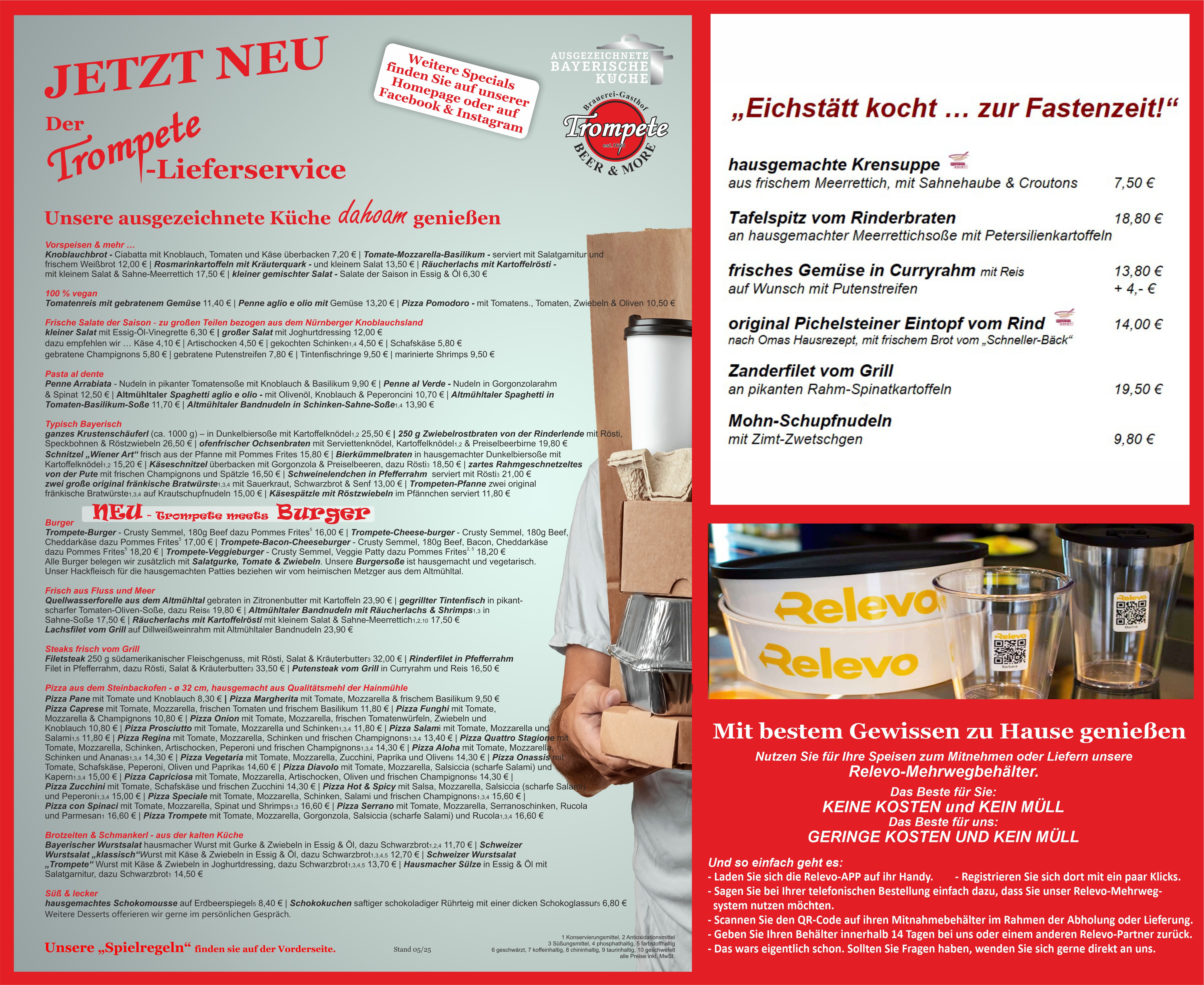 Der Brauereigasthof Trompete in Eichstätt liegt im Herzen von Bayern im Altmühltal und wurde im Jahre 1620 erstmals urkundlich als Gasthof und Unterkunft erwähnt. Sein historischer Charme und seine gleichzeitig durch zahlreiche Renovierungen und Erneuerungen erreichte jugendliche Frische verleiht der Trompete seine Einzigartigkeit und Beliebtheit.